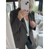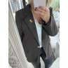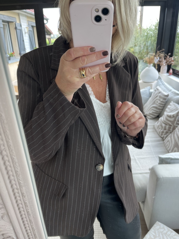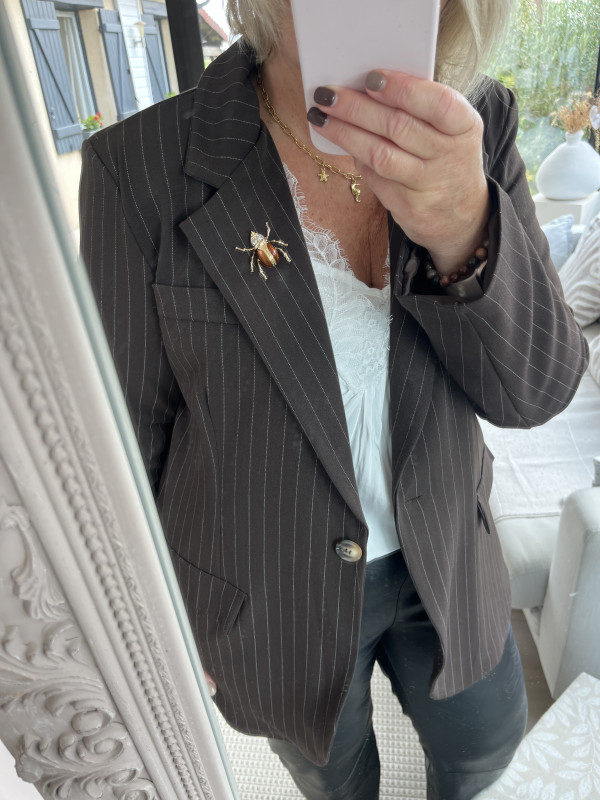 Blazer marron à fines rayures, avec broche scarabée dorée. idéale pour un look chic et élégant.