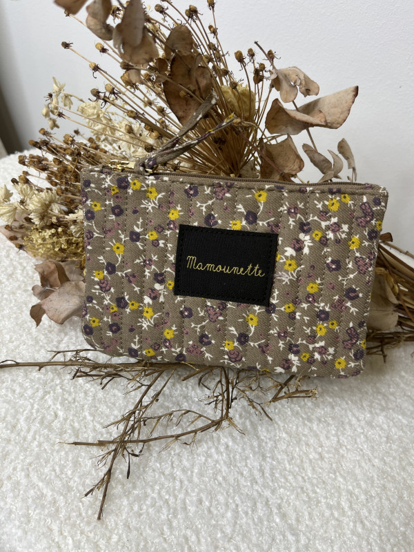 Pochette coton liberty " Mamounette " taupe, fermeture zip